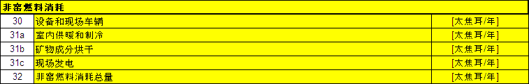 非水泥窑燃料消耗量在030行至032行中按能耗总结,单位为万亿焦耳每年[TJ/yr]。.