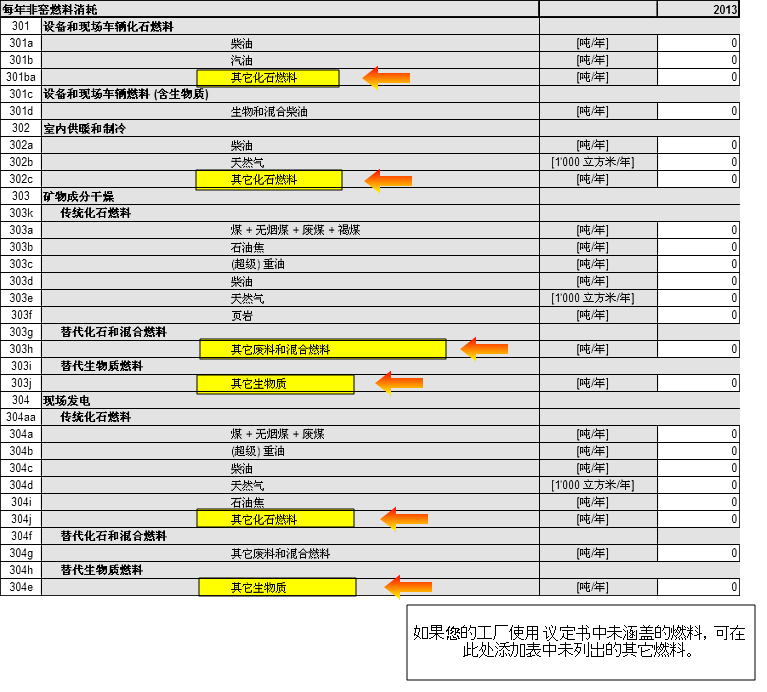 如果您正在使用某个部分的某一类型中未包括的其它燃料,则需要在标有“其它”种类燃料的行中报告这些燃料种类。
