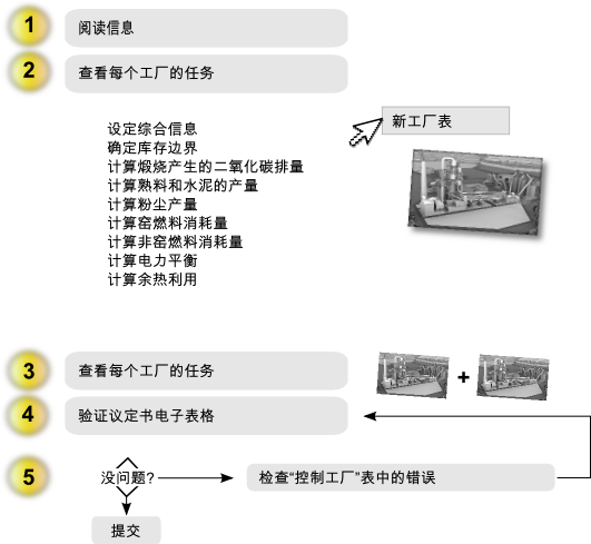 主要任务为报告并提交正确的数据,并将数据填入到能效议定书电子表中的工作表的适当位置。每项任务可能由多个子任务构成,子任务在该网络手册中详细说明以便为您提供水泥行业CO2和能效议定书报告过程的指导。
